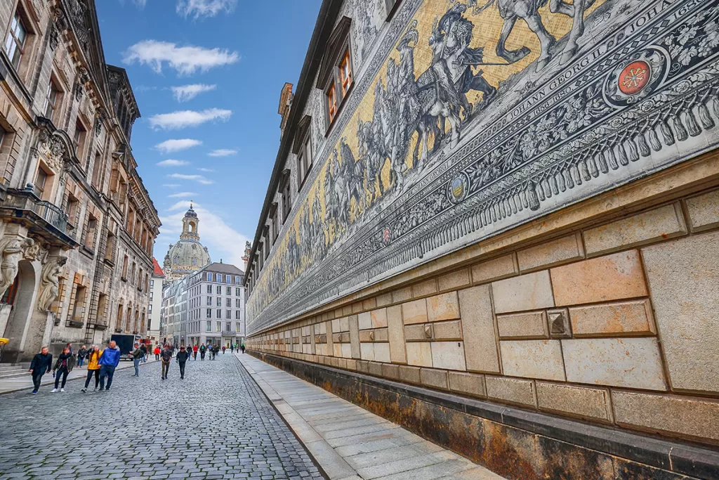 V ulici Augustusstrasse najdete Knížecí procesí (Furstenzug), 102 metrů dlouhý obraz poskládaný z porcelánových kousků, znázorňující postavy knížat a dalších významných osobností saské dynastie.