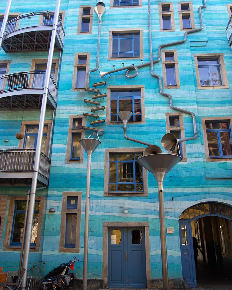 Najdete zde spoustu alternativních obchůdků, bary, kluby a street art. Mým cílem byla Kunsthofpassage, což je průchod mezi činžovními domy, kde sídlí restaurace, obchůdek s čaji a květinami, ale také dům s modrou fasádou, který za deště „zpívá“. Tato strana domu je ozdobena systémem nálevek a okapů, které nápadně připomínají hudební instrumenty, a které se během deště samy rozezní.