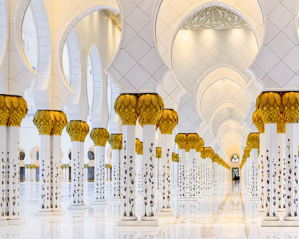 Hlavní modlitební síň ohromí svými 96 sloupy vykládanými perletí a sedmi obrovskými lustry vyrobenými z milionů křišťálů Swarovski.